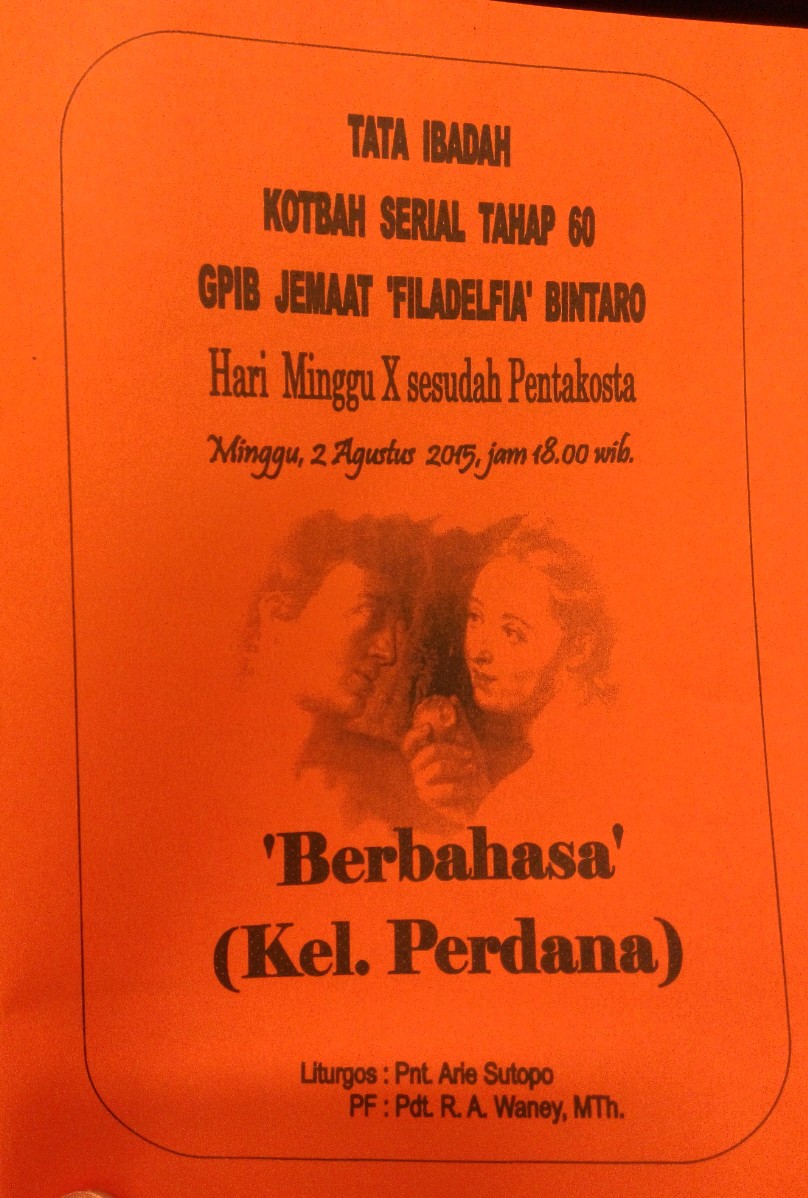 Waktu sore hari sengaja aku siapkan untuk beribadah ke gereja. Selepas penat seminggu, ternyata diri ini tidak hanya butuh makanan-minuman jasmani, ataupun ilmu dan keterampilan saja. Ternyata itu semua sifatnya duniawi. Kehausan pada hal-hal rohani ternyata menggerogoti diri. Beruntung Tuhan siapkan sesuatu yang sangat baik kemarin itu. Kaki melangkah mantap tepat pukul 18.00 mengikuti ibadah di Gereja Protestan di Indonesia bagian Barat (GPIB) Jemaat Filadelfia, Bintaro.